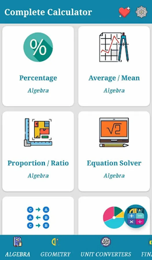 • Algebra, Geometry, Unit Converters, Finance, Health & Misc