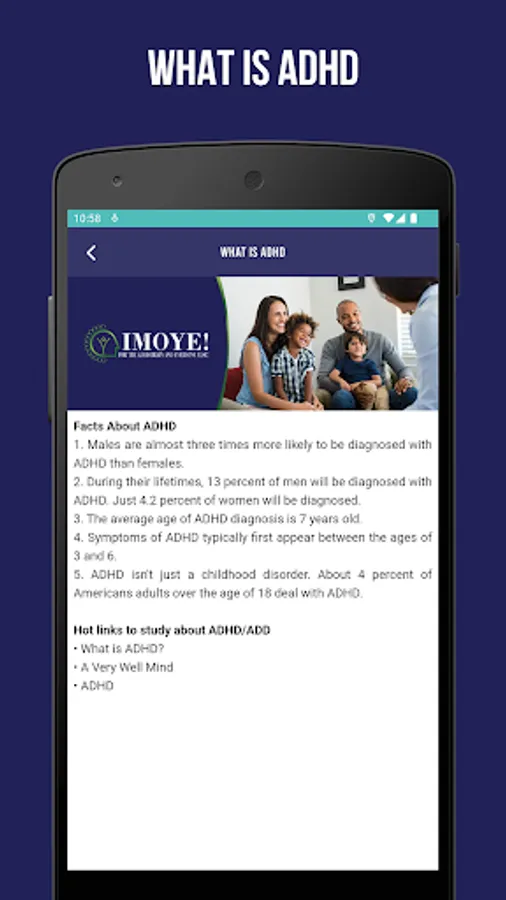 Imoye is a mobile application, designed to expose users to a wide variety of educational tools and resources, which pertain to the self-management of attention deficit disorder. In addition, Imoye aims to assist users who seek to self-educate on the topic of attention deficit disorder. Please note, this application does not take the place of one being provided an official diagnosis nor therapy by a licensed party.