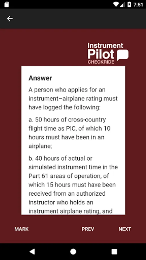 This Instrument Pilot Checkride app is based on the popular Instrument Oral Exam Guide book by Michael Hayes. It is designed for pilots training for the Instrument Rating or the Instrument Flight Instructor (CFII) certificate. More than 450 questions and responses ensure all the subjects an Instrument Rating candidate will be tested on during checkrides and IPCs are covered. Topics include: flight planning, departure, en route, and arrival. A separate chapter is provided for CFII applicants. Answers and explanations were researched using FAA documents (which are identified so pilots know where to go for further study) as well as interviewing FAA examiners. Questions can be marked for further study from any subject to build your own collection of flashcards. An Applicant Practical Test Checklist, CFII Lesson Plan, and Instrument Proficiency Check Guidance document are also included. Effective preparation for tests issued under the guidance of the new Airman Certification Standards (replacing the Practical Test Standards).