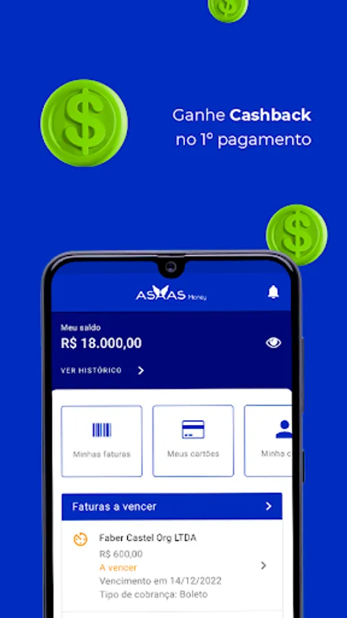Paying your Asaas invoices just got easier with Asaas Money! Take advantage of making online payments directly in the app and earn cashback on the 1st payment.