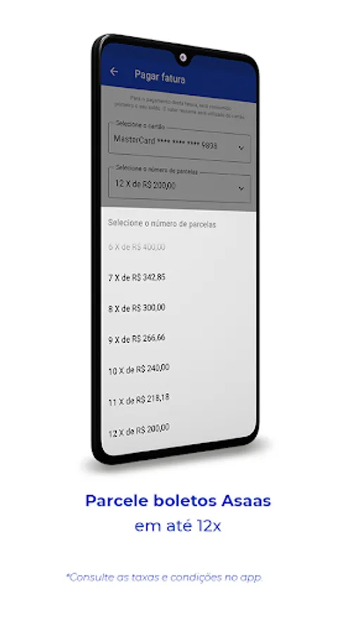 With the app it is possible to pay Asaas boletos in up to 12 installments to finance your debts. All made for you to pay your Asaas invoices in installments without weighing on your pocket!