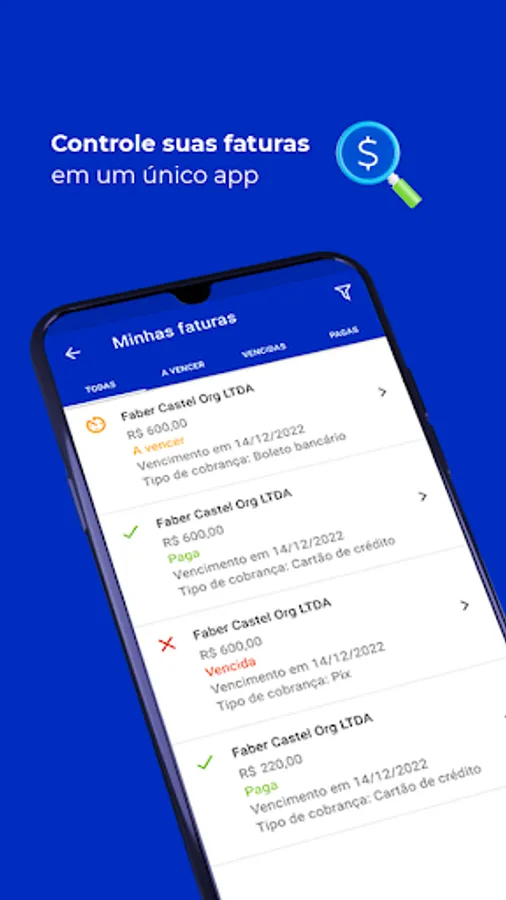 In the app you will find all the information about your Asaas invoices: due invoices, overdue invoices and paid invoices, everything so you don't worry about your bills and make your routine easier!