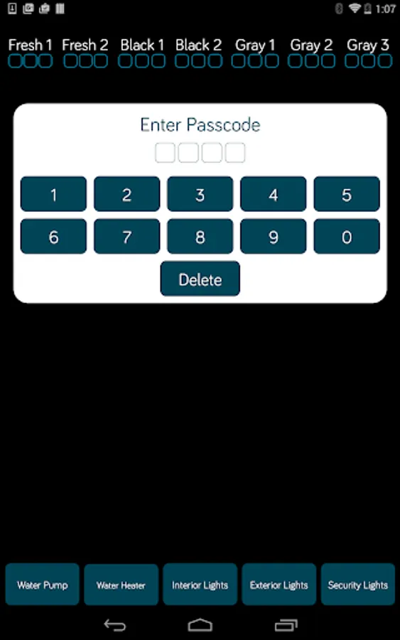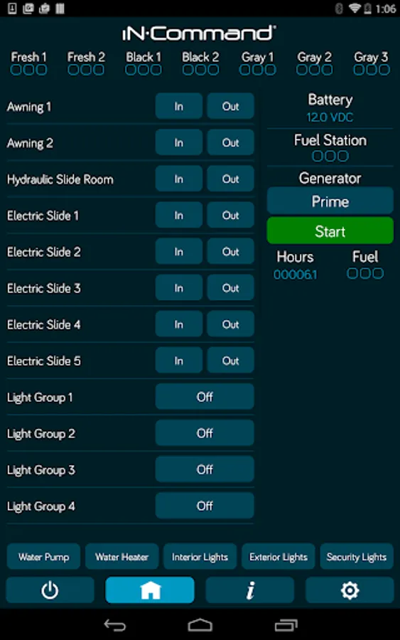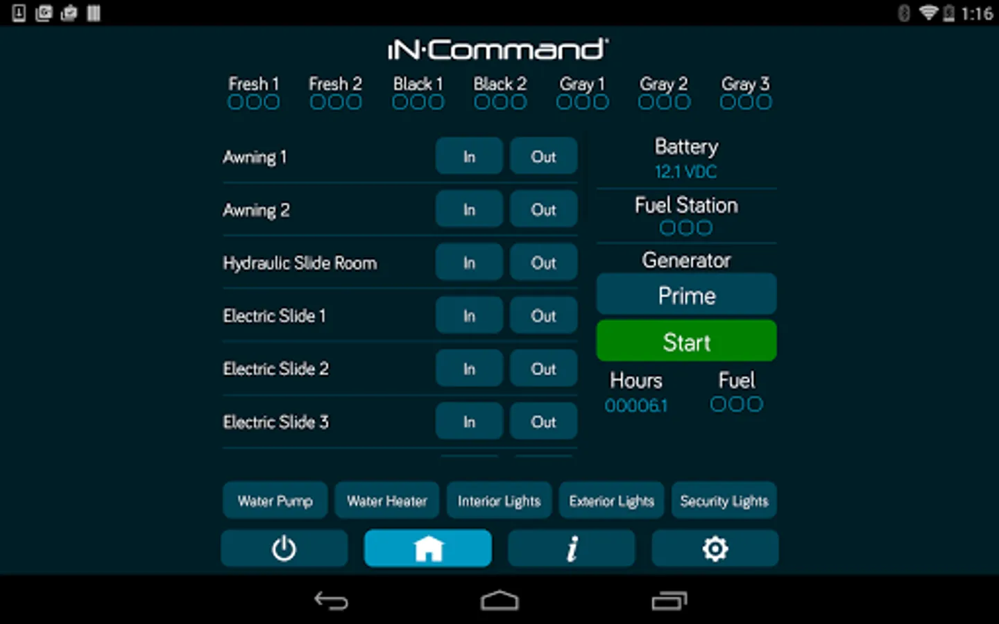 • Lighting control: Interior, exterior, security, awning and custom 1, 2, 3