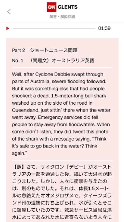 We have prepared a "CNN audio version" that uses CNN's news audio as it is, and a "narrator audio version" that has the same content read again by a narrator. You can choose according to your level. The "CNN audio version" not only uses live audio that is being watched in the United States and around the world, but also develops the skills to understand "various English" necessary to "actually communicate in English". measure. CNN has news from anchors and correspondents from various regions, not only the United States, but also the United Kingdom and Australia. You can test your listening skills in a variety of formats, such as interview questions in English spoken by people of various nationalities, and video viewing questions using actual news footage from CNN.