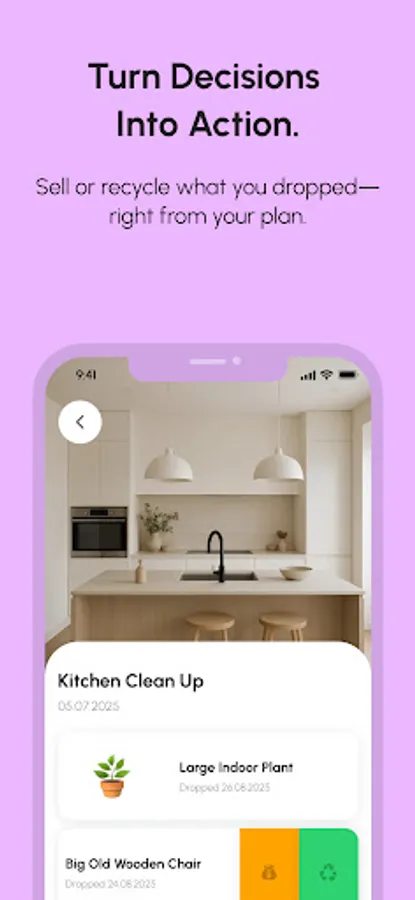 Decluttify doesn’t just help you decide—it helps you act. Instantly organize dropped items into actionable lists, making it easy to sell, donate, or recycle. Take control, reduce waste, and even earn back value from unused belongings—directly from your personalized plan.