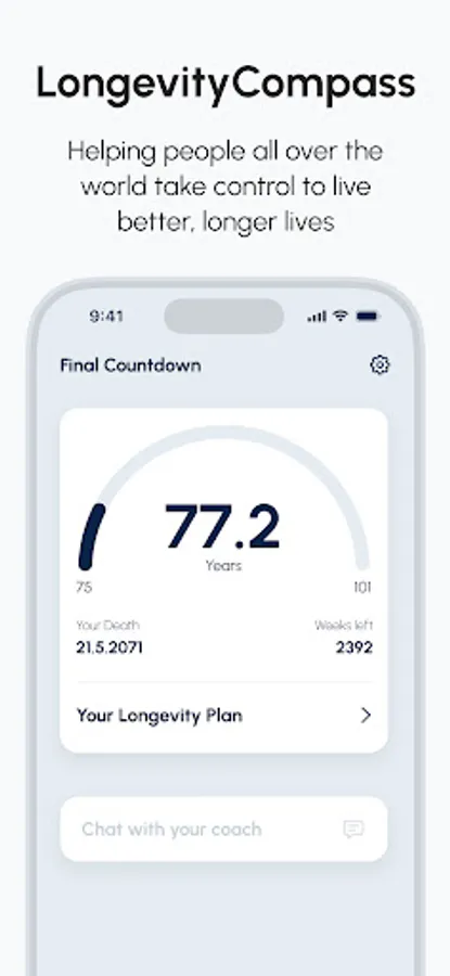 Longevity Compass is your personal guide to living a longer, healthier life. Using detailed insights about your lifestyle, habits, nutrition, and healthcare, our app calculates your most precise estimated lifespan and empowers you to make small changes with big impact. Receive expert recommendations and personalized plans tailored to your needs. Track your progress, chat with a longevity coach for expert support, and take control of your health journey. Start extending your healthy years—one habit at a time!