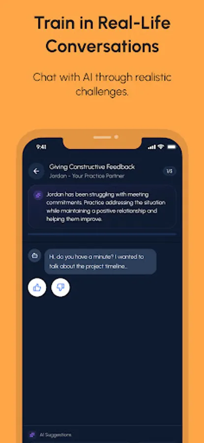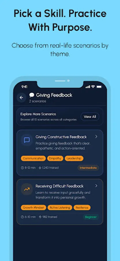 - Choose from expertly designed scenarios across feedback, conflict, leadership, and negotiation
