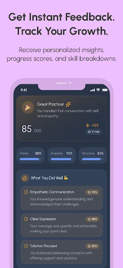 After each session, Scenario Coach delivers clear, actionable feedback. Track your progress with skill scores, detailed breakdowns, and personalized insights into your strengths and growth areas. Discover exactly how you’re improving in clarity, empathy, and structure, and receive practical tips to keep advancing.