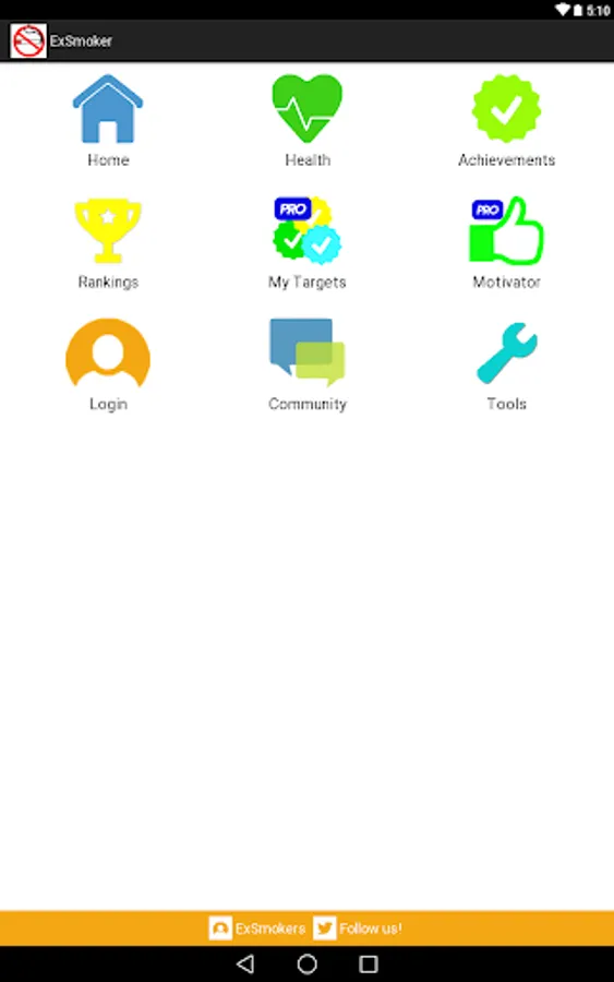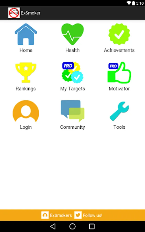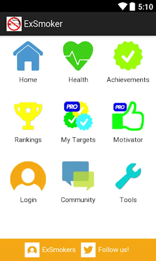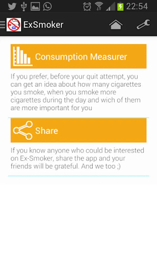 - Home: shows how long you've been without smoking, the money you have saved and how many cigarettes you have not smoked in this time