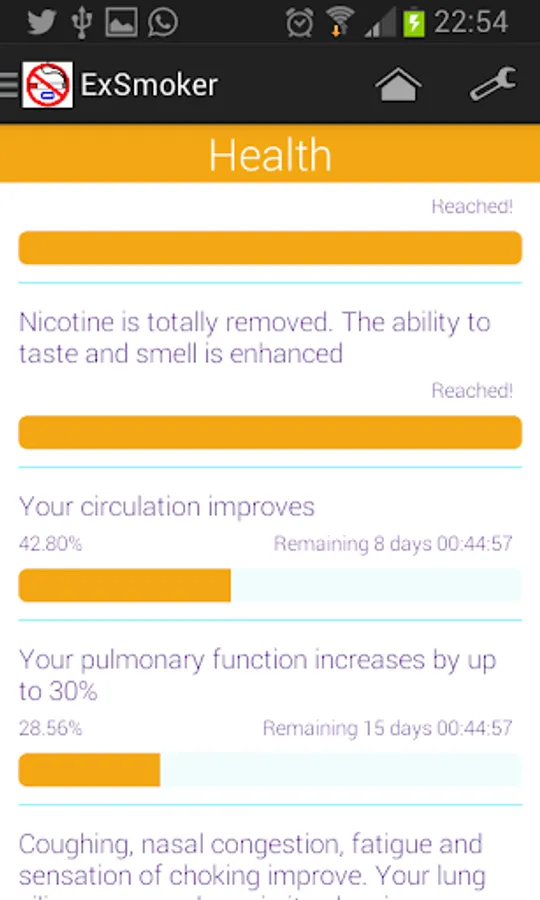 - Health: indicates the progress of the benefits of quitting, with progress bars.