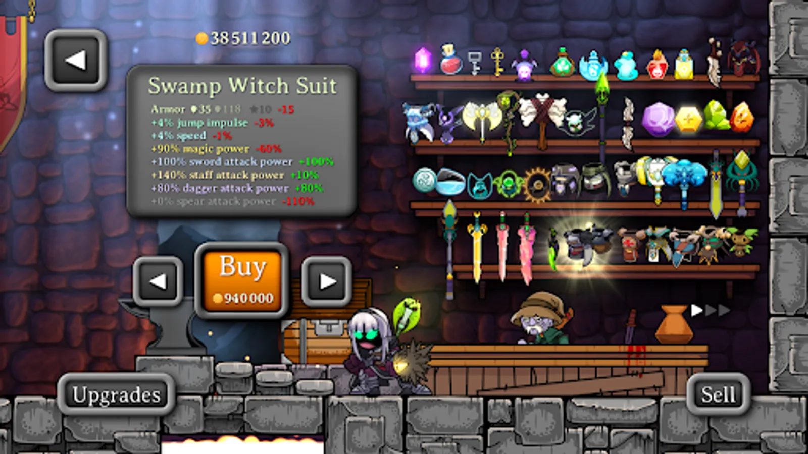 Meet the salesman and browse his shop. He offers the best gear you will find around the kingdom, including the rare runes, which you can use to upgrade all your equipment. Despite being bad-tempered, he will be crucial on your fight against challenges waiting for you!