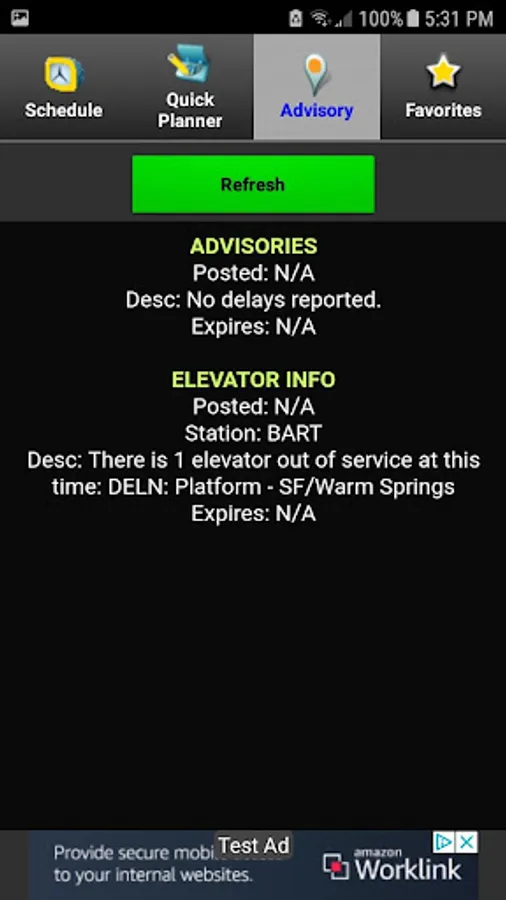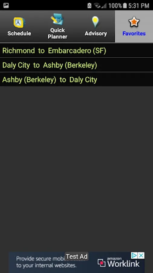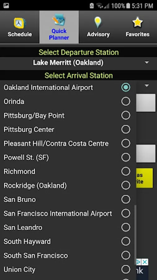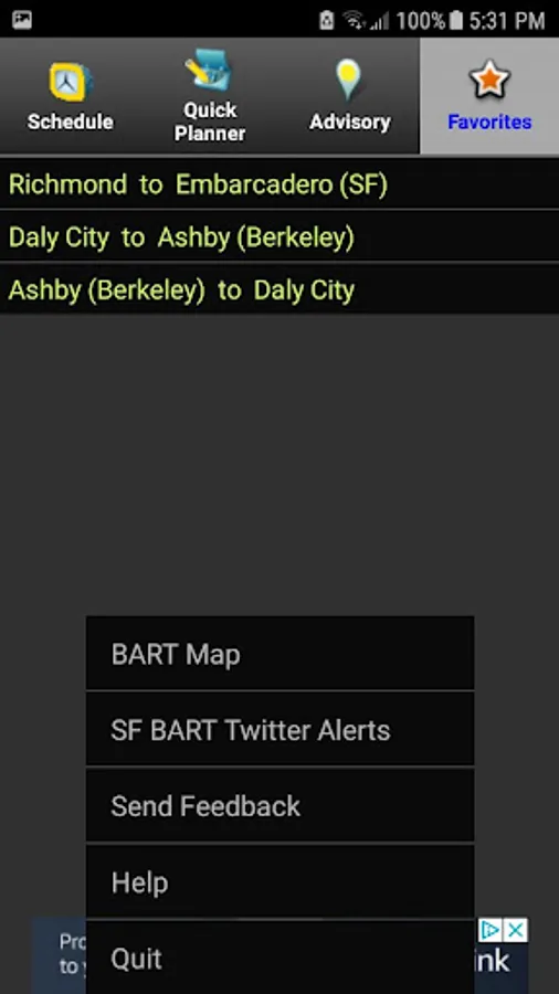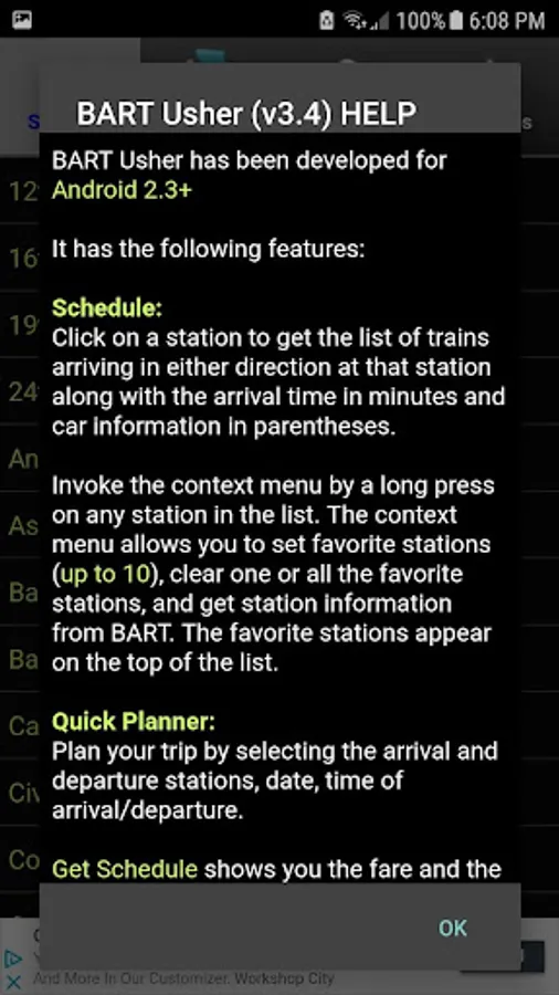 The BART Usher provides real-time BART information. It enables you to retrieve real-time train information for any station, to plan your BART trips, and to get advisories and elevator info for the system, and save favorite routes. It also includes a BART system map for reference.