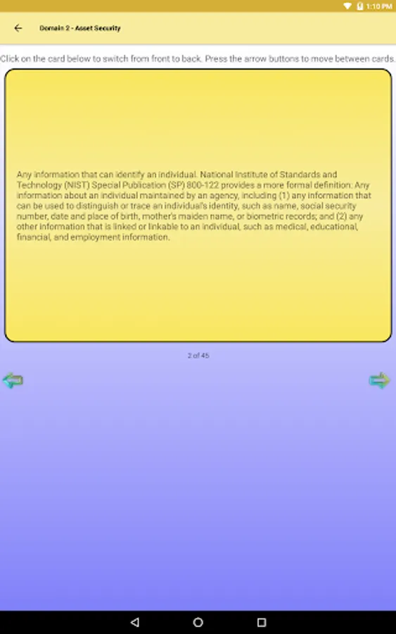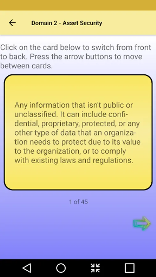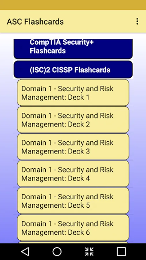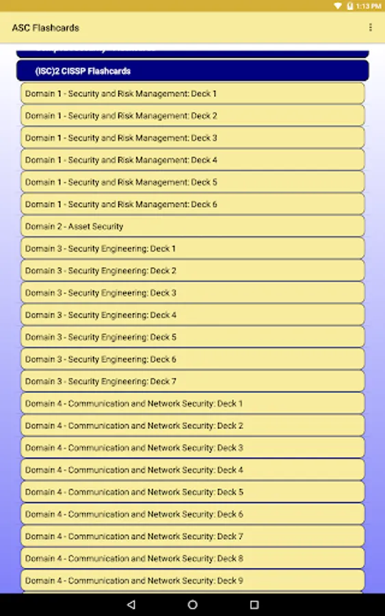 Our ASC Flashcard's CISSP content is arranged to correspond to the 8 domains of the CISSP examination. Use our digital interactive flashcards to learn or review information security concepts and industry best practices. The domains covered are (1) Security and Risk Management, (2) Asset Security, (3) Security Engineering, (4) Communication and Network Security, (5) Identity and Access Management, (6) Security Assessment and Testing, (7) Security Operations, and (8) Software Development Security.