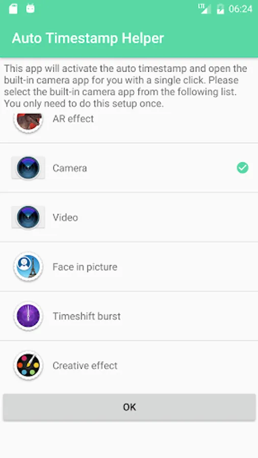 This is a helper app for the Camera Auto Timestamp. This app will activate the auto timestamp and open the built-in camera app for you with a single click. You need to install Camera Auto Timestamp (https://play.google.com/store/apps/details?id=com.ascendapps.cameraautotimestamp) before using this app.
