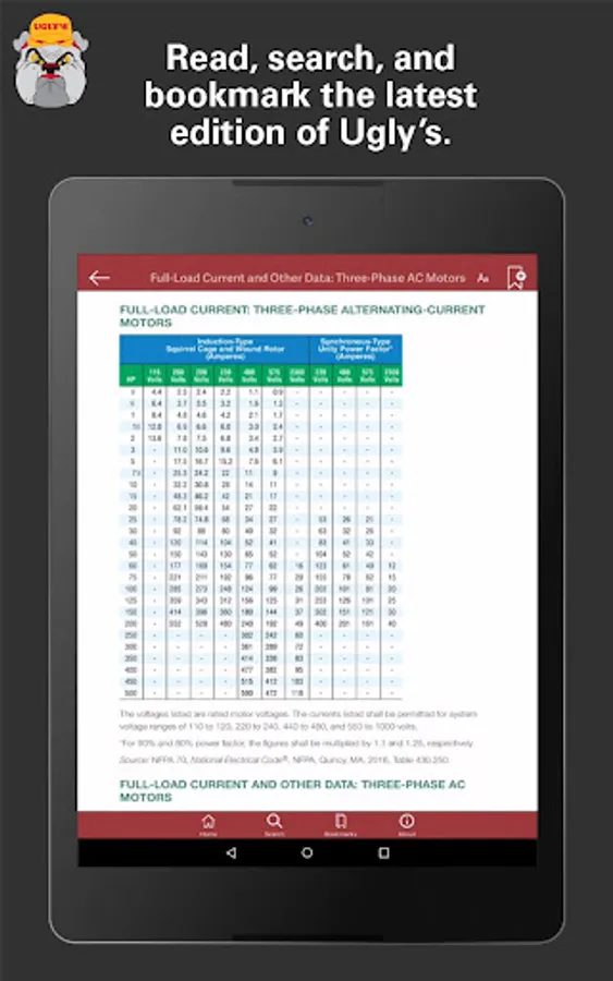 The Ugly’s Electrical Reference app is part of the popular Ugly’s Professional Reference® series which is an imprint of Jones & Bartlett Learning. National Electrical Code and NFPA 70 are registered trademarks of the National Fire Protection Agency and are not associated with Ugly’s Electrical References in any way.