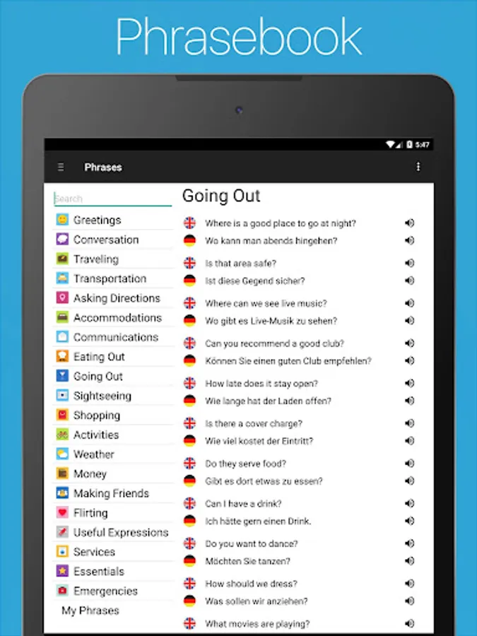 ✓ Phrasebook with 20 categories such as Conversation, Asking Directions and Making Friends.
