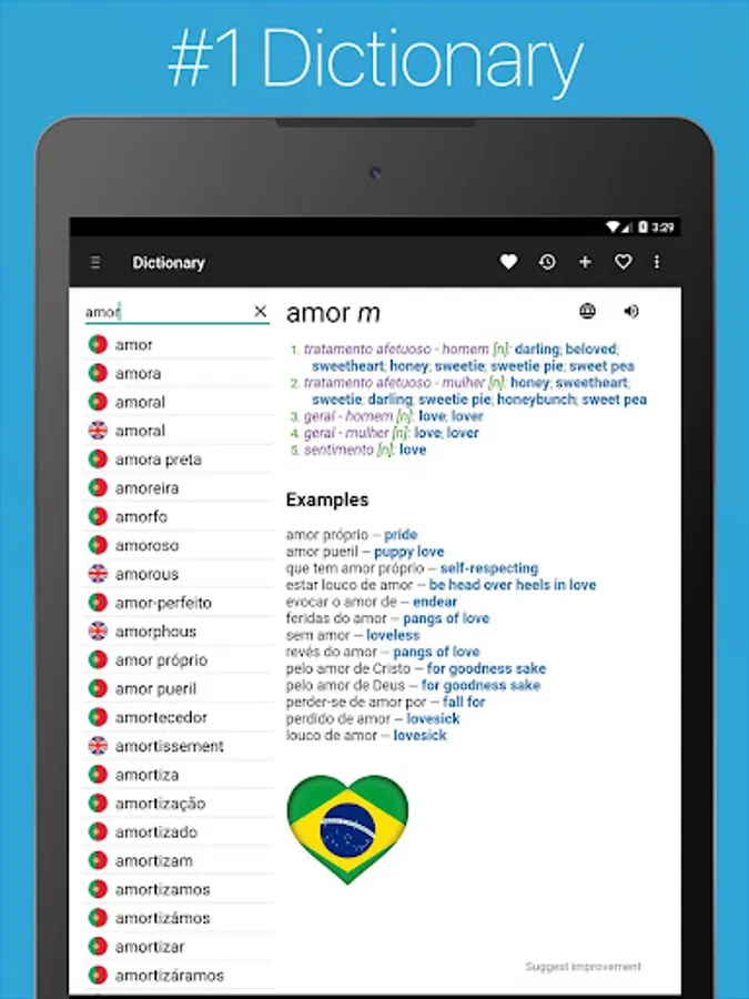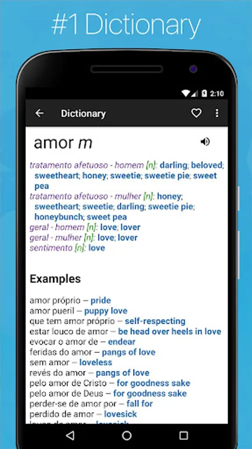 The leading Brazilian - Portuguese - English Dictionary for Android Phones & Tablets ✦ Comprehensive Offline Dictionary ✦ Phrasebook ✦ Verb Conjugator ✦ Phrase Translator ✦ Flashcards ✦ Audio Pronunciation ✦ Vocabulary Quizzes