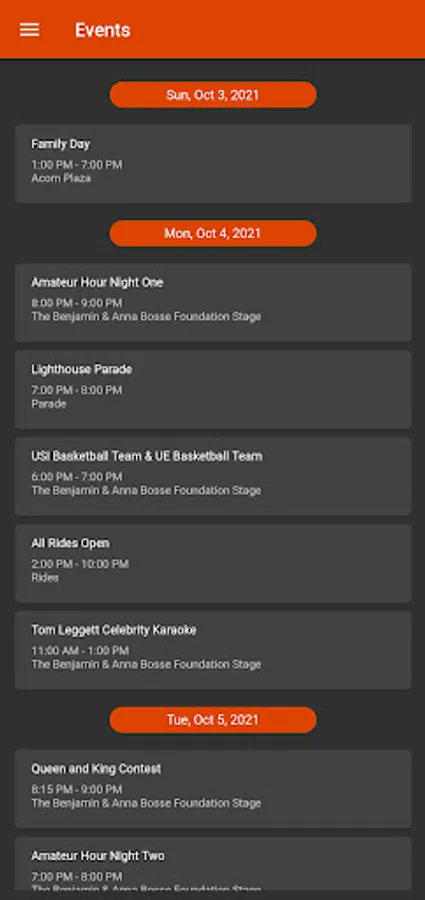A list of the Fall Festival's events with date and time, don't miss out on the parades! Add the events directly to your calendar.