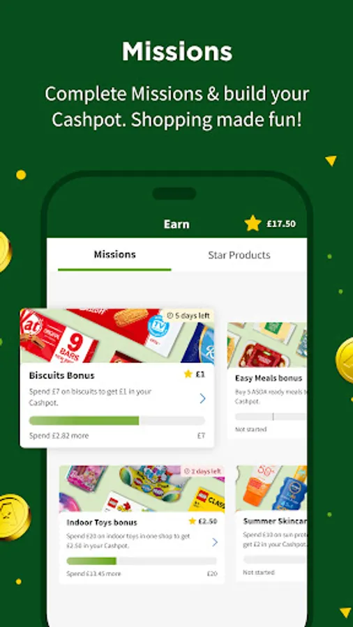 Download the app and start scanning. It’s that simple. Across the store and online, you’ll find lots of ways to build your own Asda Rewards Cashpot. You can also use your app to check out how you’re progressing towards completing Missions and see when your favourite products are available as Star Products.