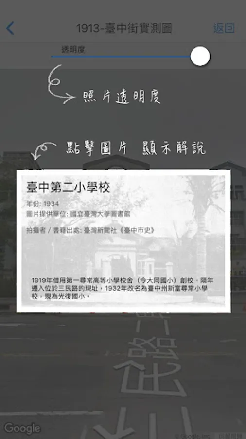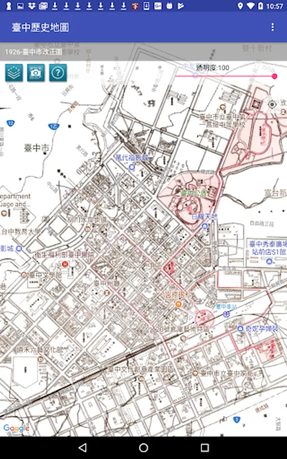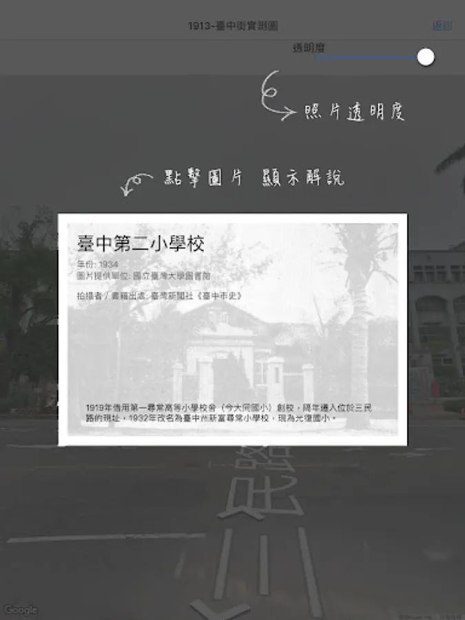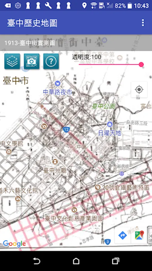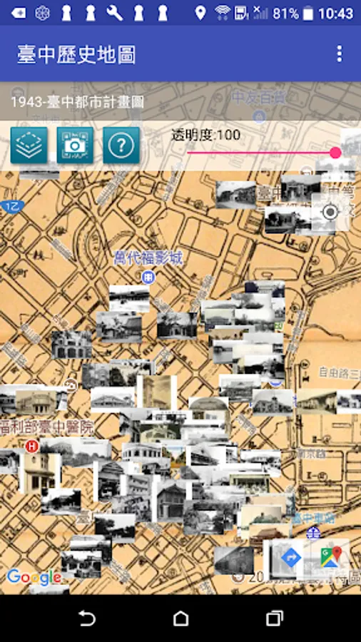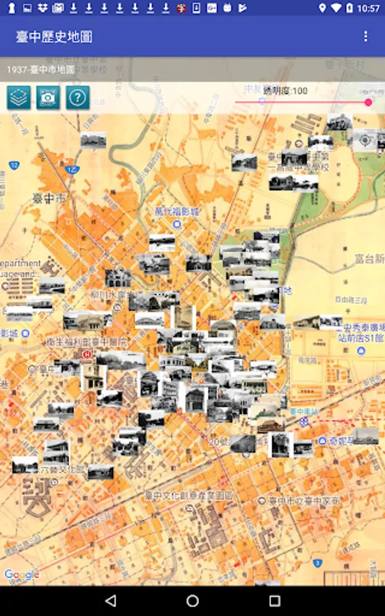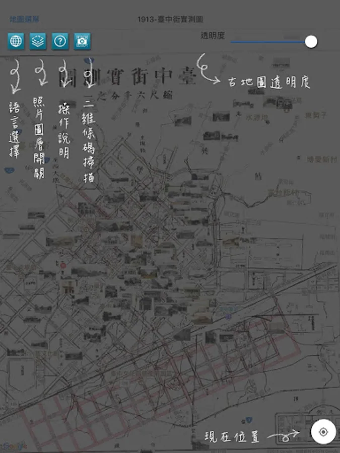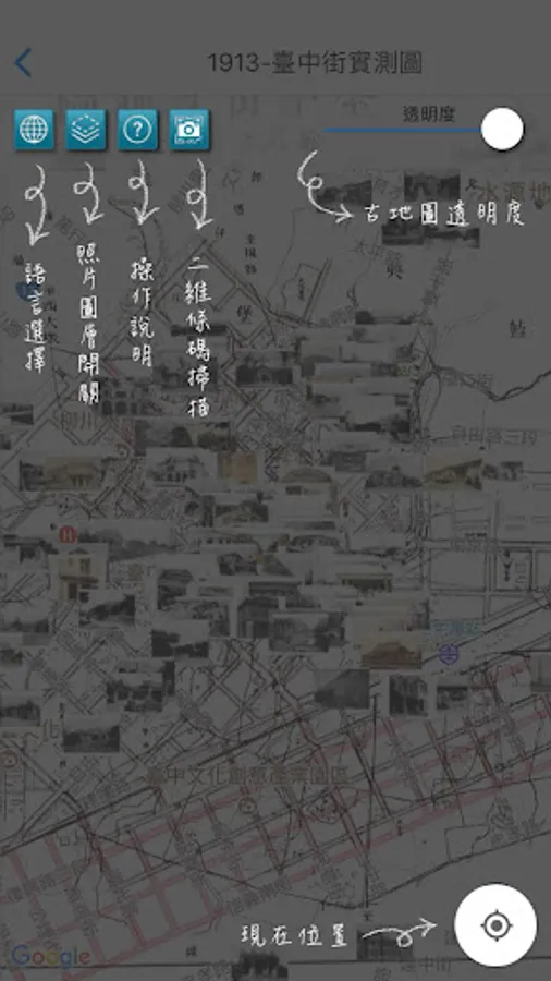 Taichung collection of historical maps from 1895 to 1986 issue of old maps and old photographs, compared to today's Google Maps and Street View images with geo-targeting capabilities, allowing users through maps and photos, time and space were a cultural trip!