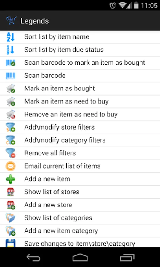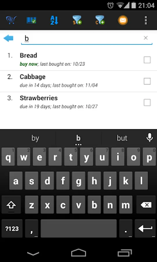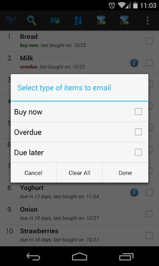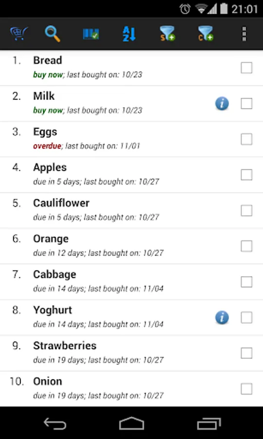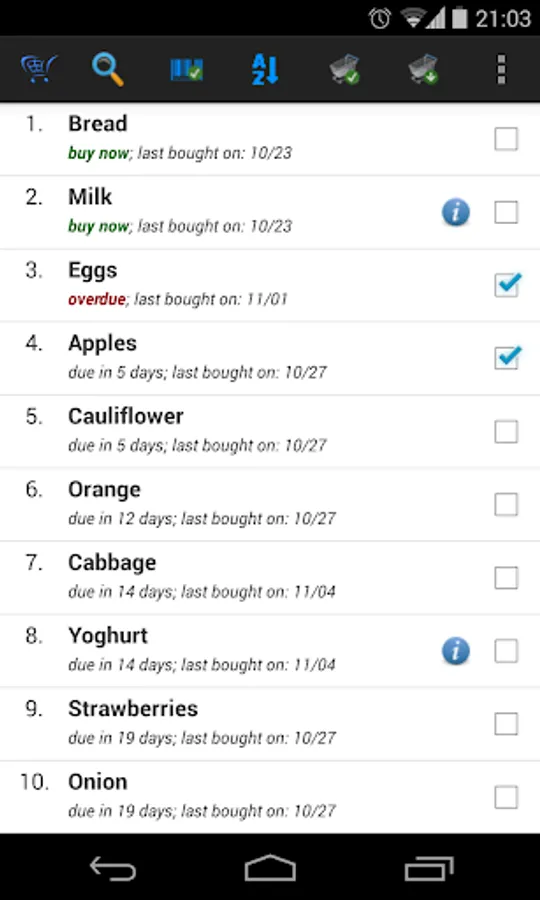 When you’re at the store, simply ask My iList to show the usual stuff you buy from there and it will tell you what items are due or close to being due. Tell it that you've bought it and it’ll reset to remind you at the interval you set initially and also based on purchase history.