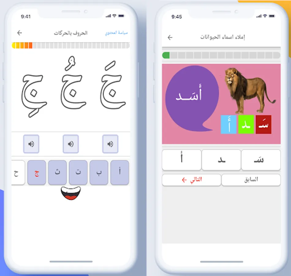 -الإملاء، وفيه يستطيع الطفل تكوين الكلمات التي يتم إملاءها عليه بالصوت من خلال لمس الحروف الموجودة على الشاشة وإعادة ترتيبها.
