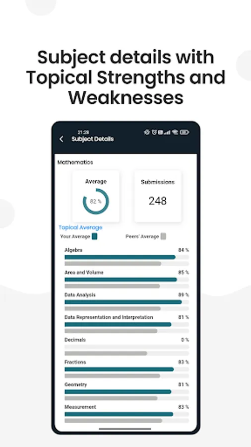 • Discover topical strengths and weaknesses with detailed analysis and peers' performance reference