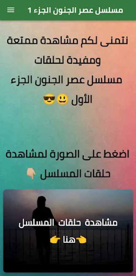 Try the application musalsal 3asr al junoon part 1, for free and exclusively on Google play
