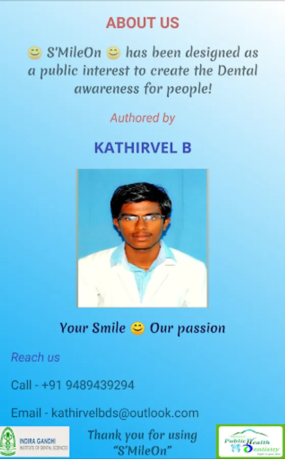 "S'MileOn" , Is a simple offline app which includes oral hygiene instructions and post operative instructions like procedures to be followed after extractions, after denture insertions etc., It is available in both Tamil and English languages so that everybody can understand these instructions easily.