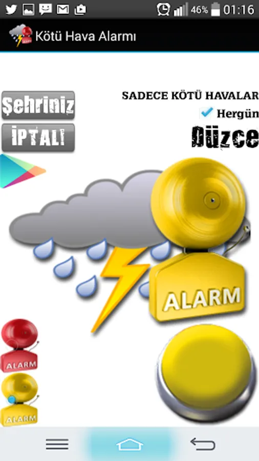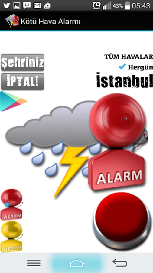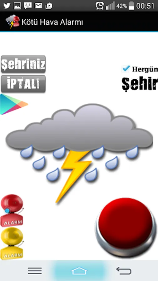 When you select the city and the type of alarm you live every morning on a regular basis that are checked weather the city, and all the weather or just bad weather to your liking bildirilir.b notification morning phone is shown in the form of animation when you get your hand. In addition, rain, hail, snow, extreme heat, extreme cold weather and so bad you are as an audible warning. You will be informed of the red alarm prostrate If you are only aware of any weather, but if you select a yellow alert in bad weather.