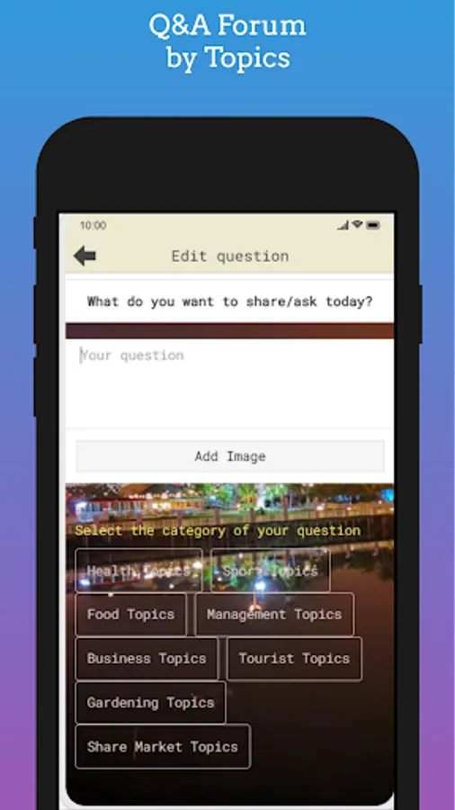 ⭐ Knowledge - To Question and Answer module is forum like feature based on Quora. The Q&A module is forum like feature based on Quora. It allows users to ask questions to the community and help other users by replying to queries. Tags can be defined to classify different topics so that the searches are more easily performed. Topics that currently set on the Personal Notepad App consists of Sport Topics, Health Topics, Management Topics, Business Topics, Food Topics, Tourist Topics, Share Market Topics, Gardening Topics, Feng Shui Topics are available. The Topics can be add-in, if there is a request from App users.