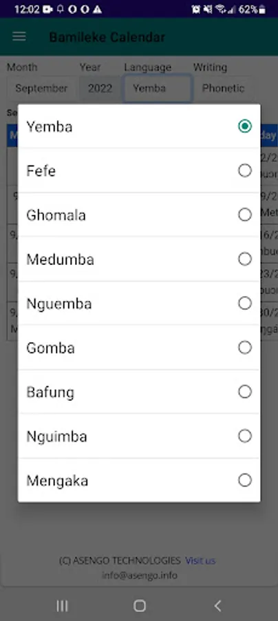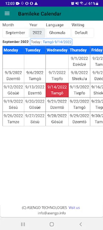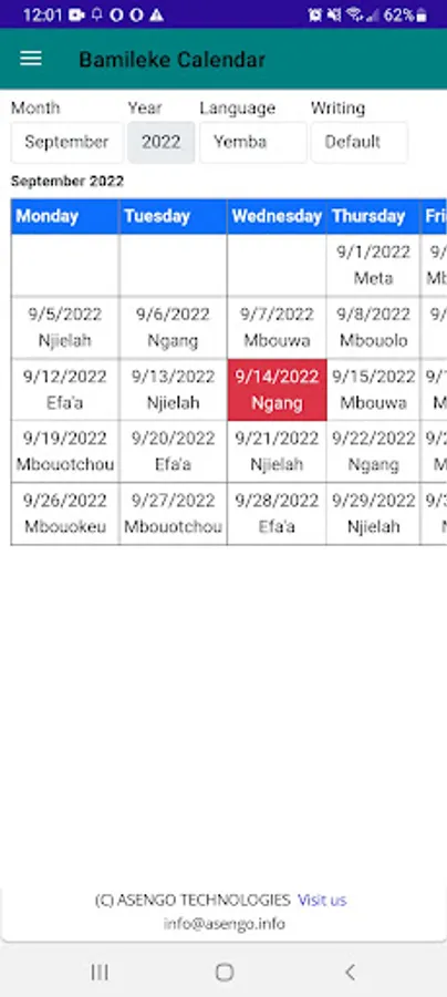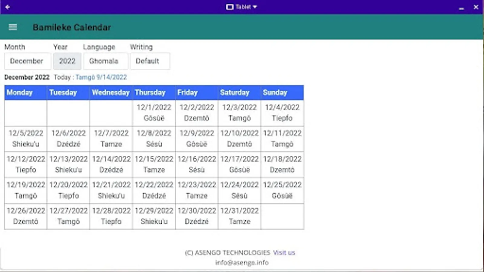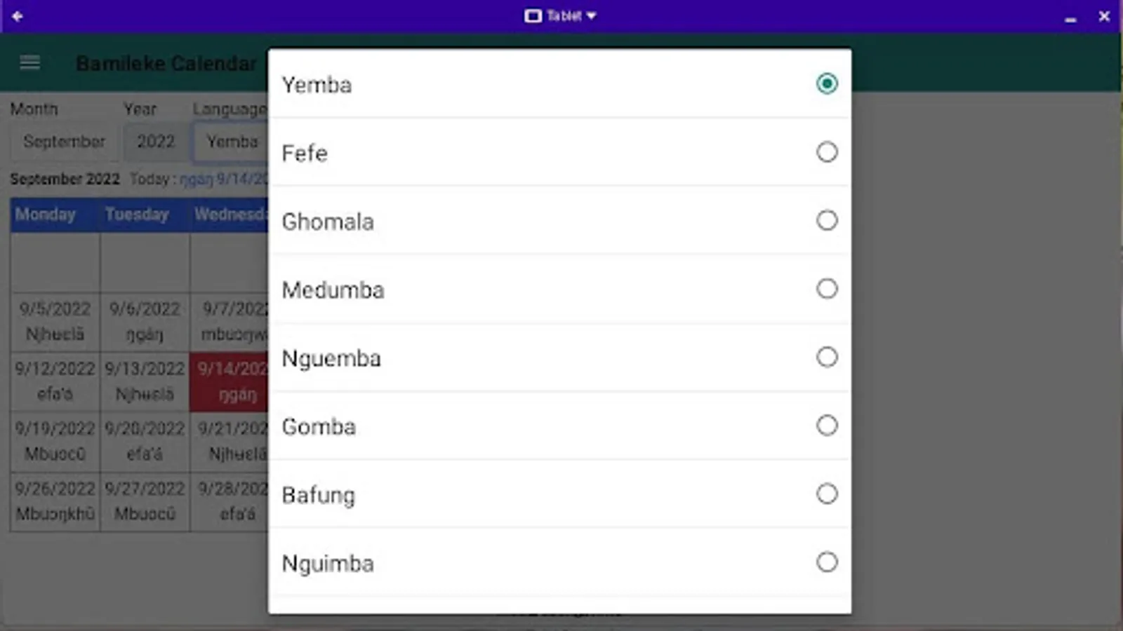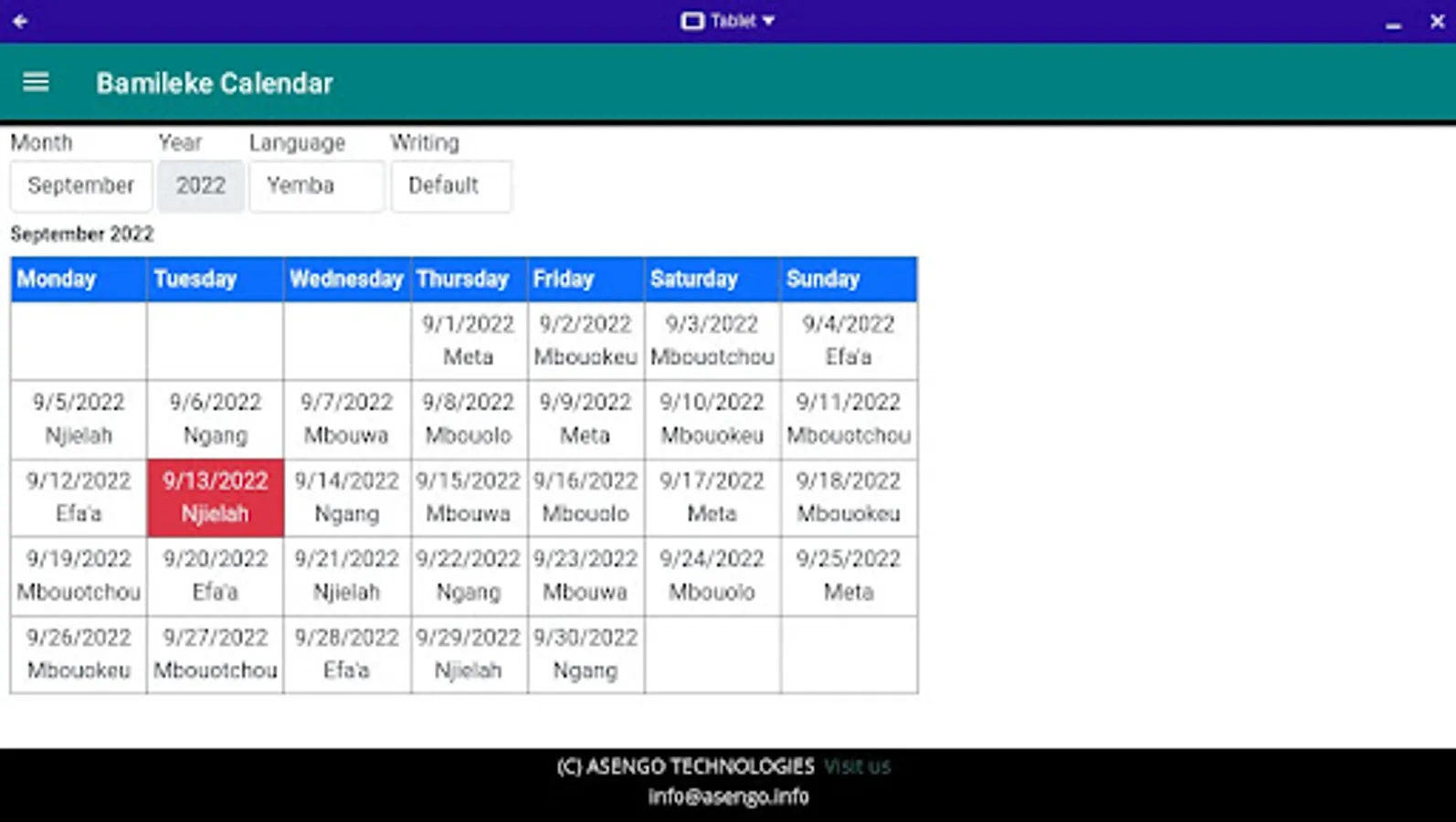 Bamileke Calendar is a standalone offline application; it displays the days of a bamileke language in the commonly used Greece calendar.