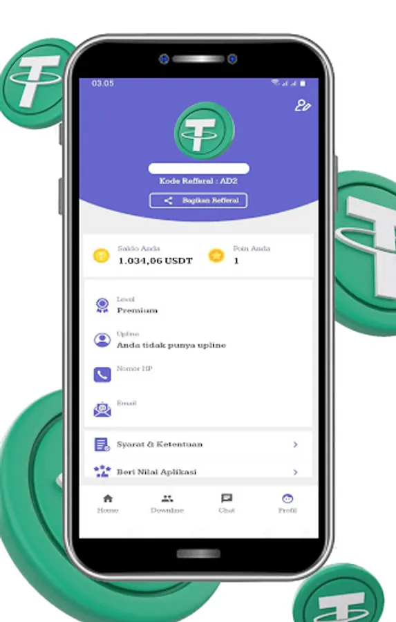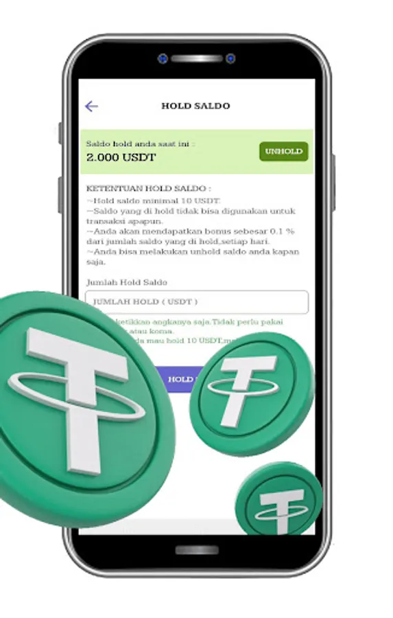 4. Pengguna Premium dapat menggunakan fitur hold usdt di aplikasi dengan keuntungan 0.1%/hari.