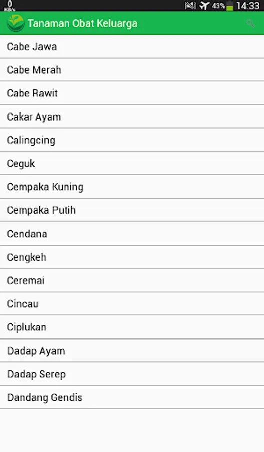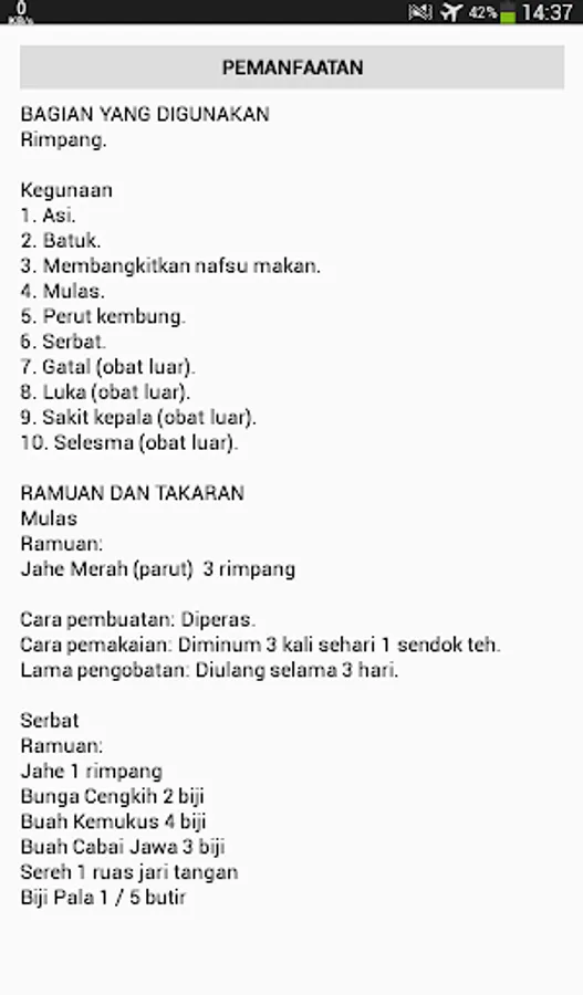 In it contains the names of efficacious herbal medicinal plants that commonly grow around us, accompanied by pictures, descriptions, search for disease names, diseases that can be treated by these herbs, how to use / concoct drugs, examples of use in the community, and information about the ingredients chemical and pharmacological effects of these plants.
