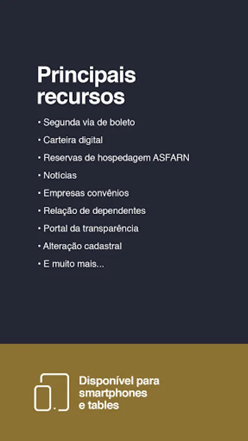 The new ASFARN application developed for the exclusive use of members is now available. With it, you will be able to have access to the second copy of the bank slip, digital wallet, ASFARN accommodation reservations, news, affiliated companies, relationship of dependents, transparency portal, registration change and much more.
