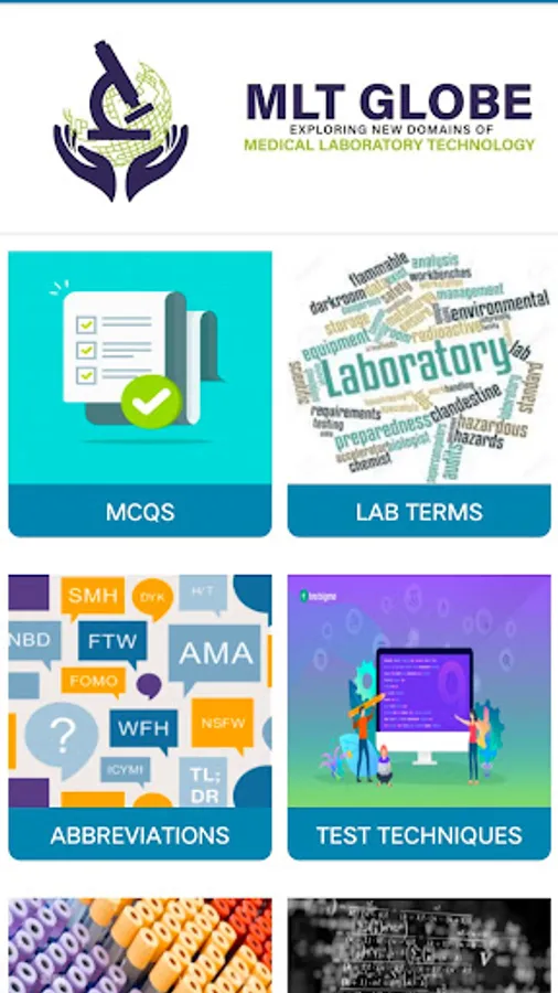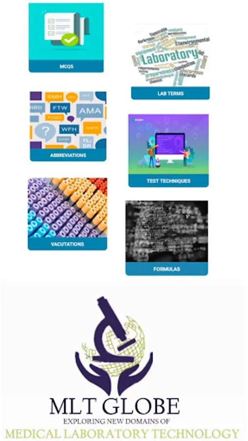 MLT Globe Application provides you Medical MCQS, Lab Terms, Test Techniques, Abbreviations, Lab Formulas and Vacutainers on one click.