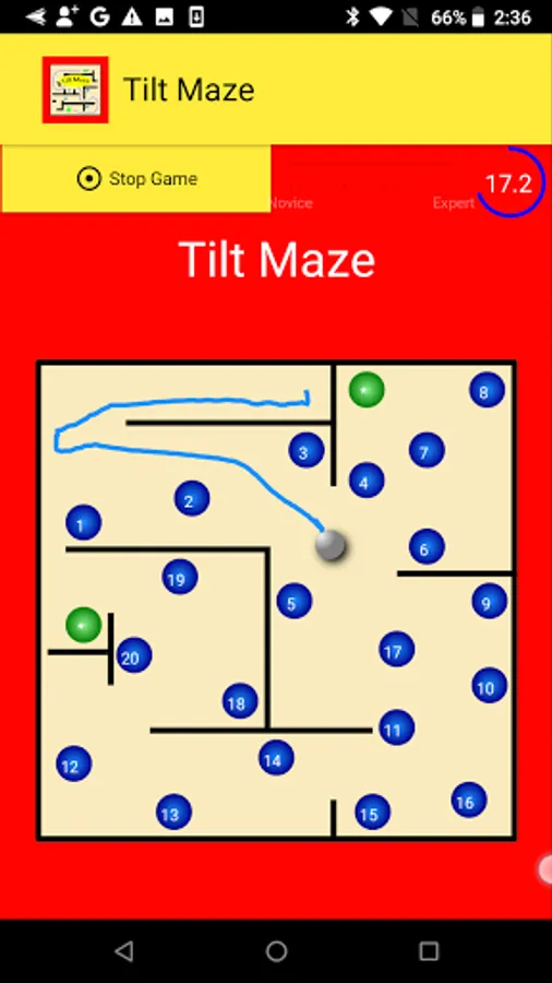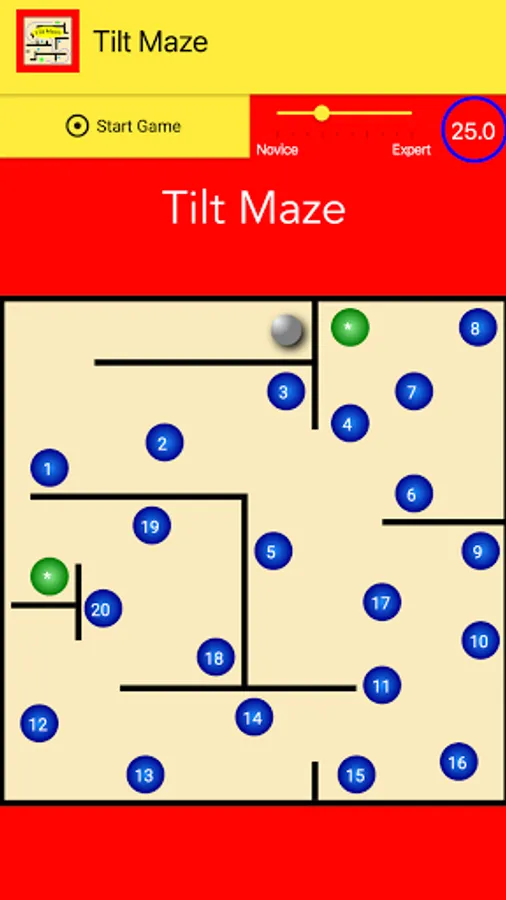 Styled after wooden box mazes that let you control the flow of a ball through barriers while avoiding holes, here you tilt your phone to control the path of the ball. As you get better, increase the difficulty by selecting faster rolls and shorter times to complete the maze. Avoid the holes! A sliding scale from novice, which gives you the easiest setting, through expert, which is the most difficult setting, lets you choose a skill level. Have fun!