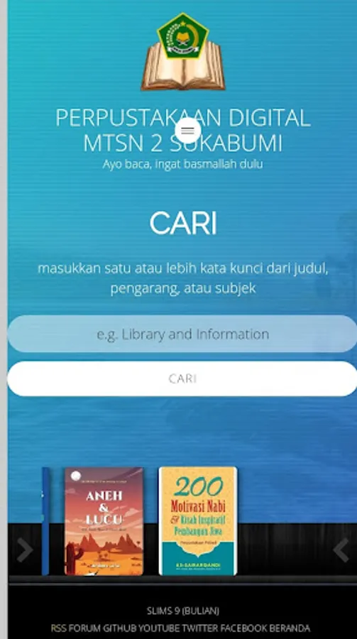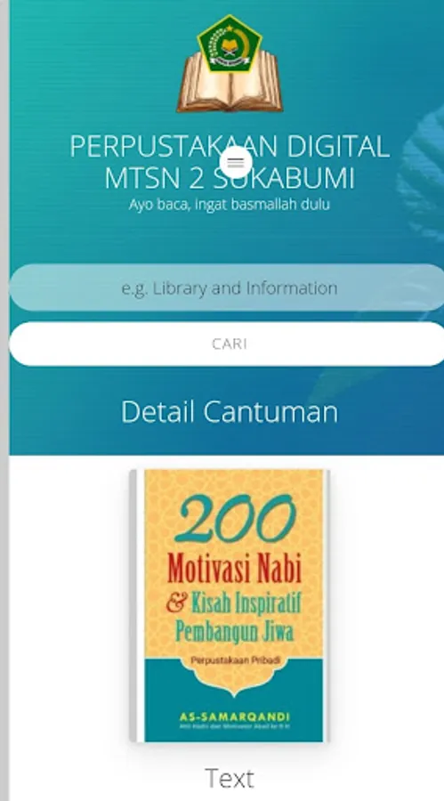 The library of MTsN 2 Sukabumi contains a collection of books ready to be read online, the book database will gradually increase.
