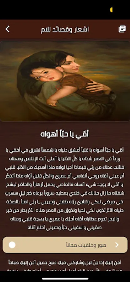 The "Poems and Poems for Mother" application is an amazing and unique application available on the Google Store. This app is a great haven for users who are looking to explore and read the sweetest words and poetic thoughts that glorify motherhood and reveal the unique and special relationship between mothers and their children.