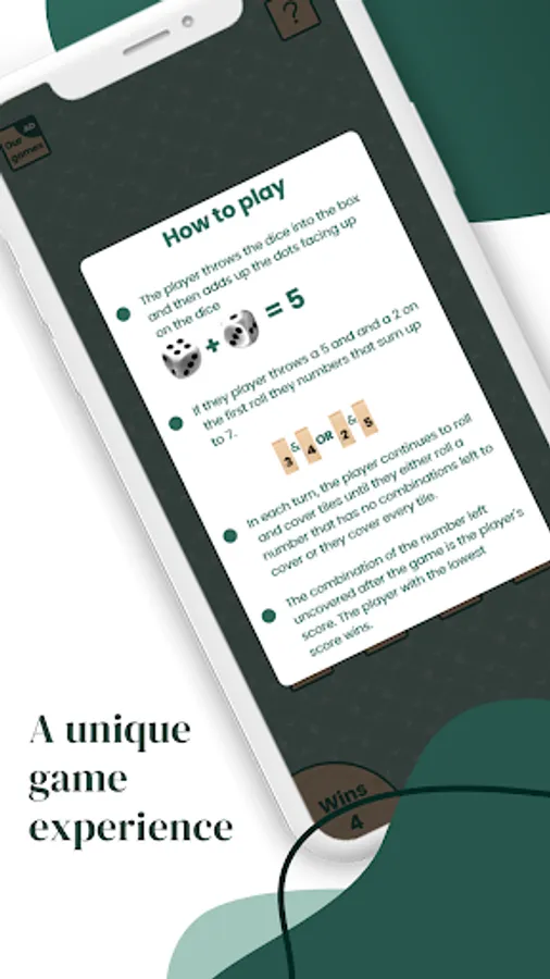 Simple gameplay: Push the button to roll the dices, add the numbers from both dices, then close the boxes based on the sum of the dices numbers.