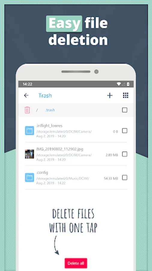 This file manager provides all typical file operations such as cut, copy, paste, rename, delete and a file transfer to the pc.