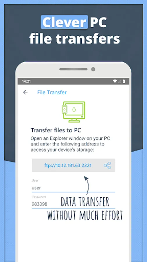 Do you wish to quickly exchange files between your Android device and your pc? Use Droid Commander's wireless data transfer which doesn't require any cloud storages or further apps.