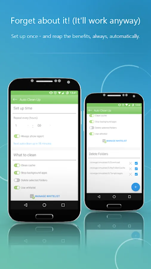 Installed apps, downloaded files, images, music, videos - over time, your smartphone will get cluttered leading to noticeable slowdowns. Ashampoo Droid Optimizer frees your smartphone from clutter and reclaims free disk space and performance - regularly and fully automatically. Need to constantly delete a folder anew? Simply add it to 1-Touch Speed Up and Auto Clean Up. This feature is also supported by Junk Finder!