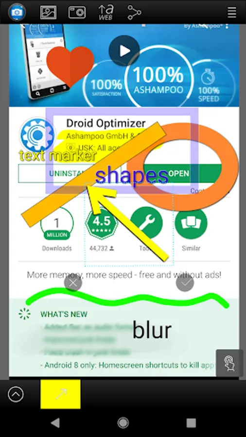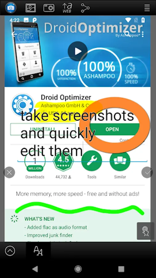Ashampoo Droid Screenshot is a fully-fledged mobile application to capture, edit and share screenshots and images on your Android device.