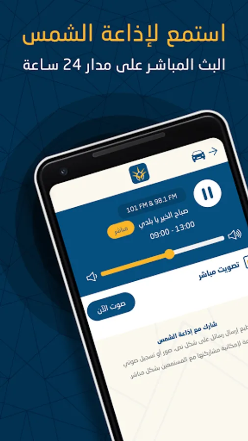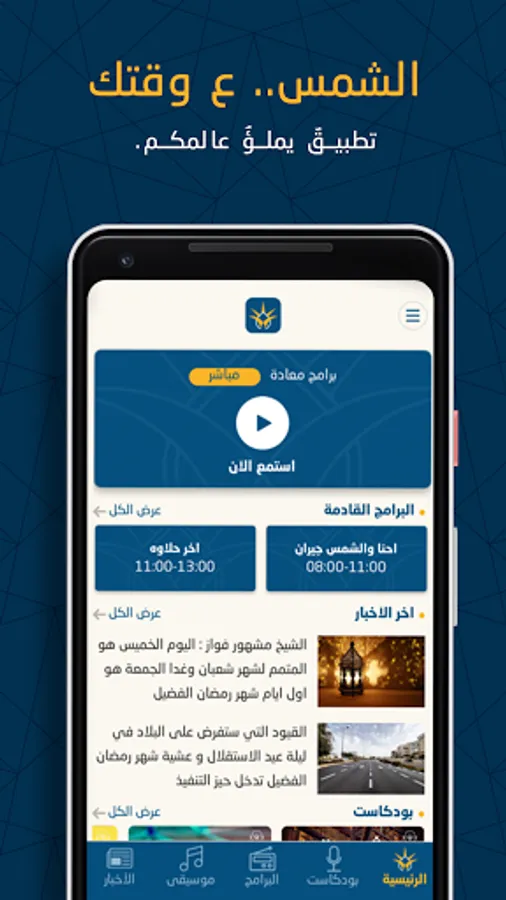 من خلال تطبيق الشمس, يمكنك قراءة اَخر الأخبار والاستماع الى برامج الاذاعة وفقراتها المختلفة وكُل ما يبث عبر أثير الشمس.