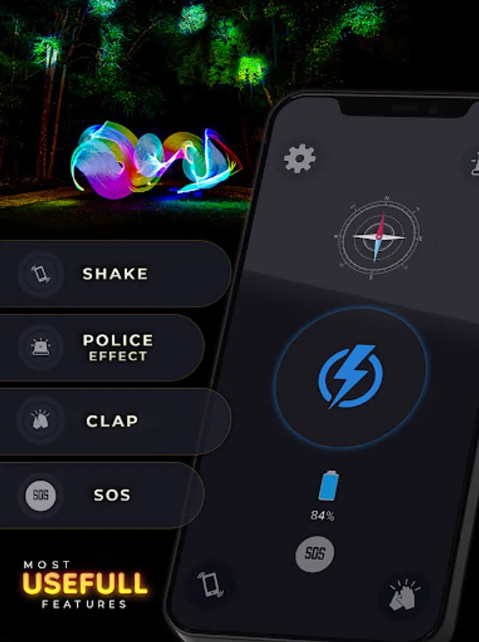 Brightest, fastest, and most powerful LED Torch light in your pocket! ?? Get the best free flashlight, get more features such as flash on clap,compass, SOS (emergency),shake your device to turn ON/OFF ans front screen color light available in it like police light, signal light and party light for fun etc on it and powerful magnifying glass all in one free flashlight! We truly believe it's the most featured rich LED Torch flashlight and the most helpful application to in your pocket.??