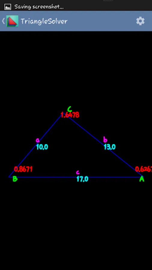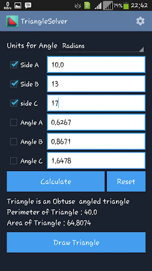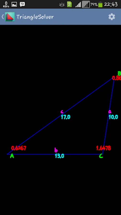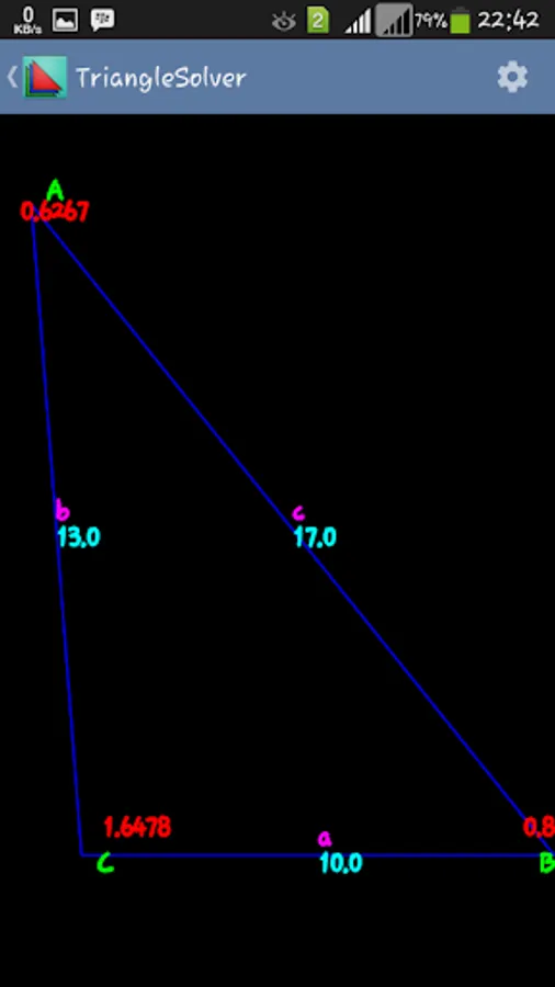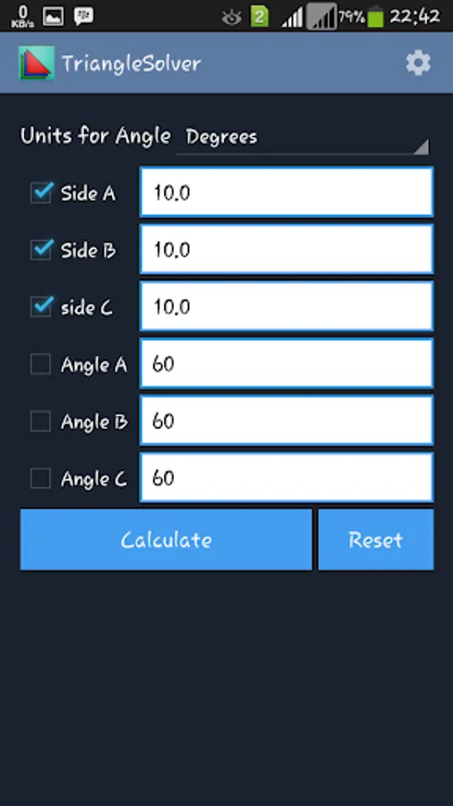 Simple Application to solve for missing parameters (sides or angles) for triangle.Given three parameters (sides or angles) the app automatically computes the remaining parameters.