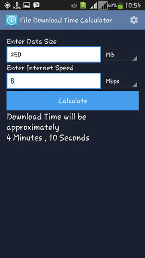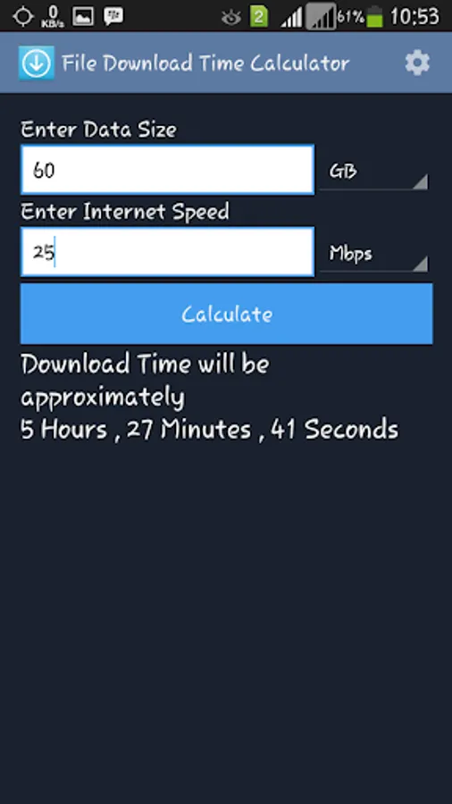 Want to know how long does it take to download a big file such as a movie or image, or mp3, or zip? This Easy to use calculator will show the download time for lots of different bandwidth's. Enter amount of data to be downloaded in kb, mb or gb,tb and Enter the internet bandwidth to get the time required for download.