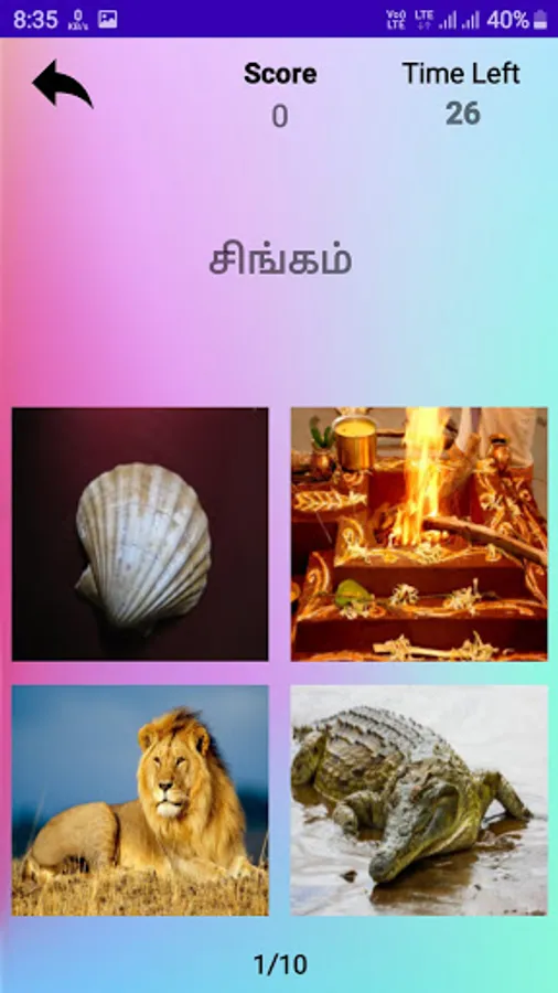This application contains 10 questions in tamil having pictures as their options and correct option is the picture related to the word in the specific question.