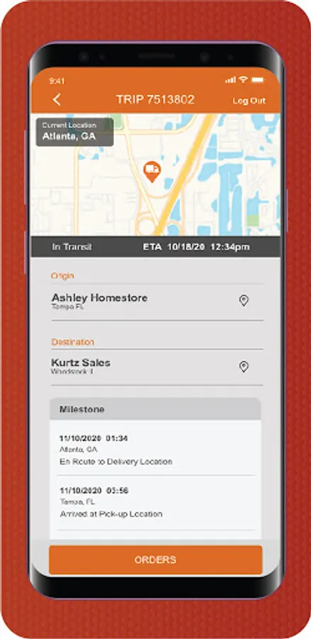 The trip details page displays the most recent location with a map view and allows you to see which customer orders are being delivered.